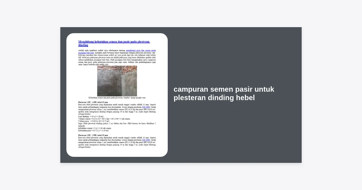 Untuk menghitung kebutuhan campuran semen pasir untuk plesteran dinding hebel, Anda bisa menggunakan rumus sederhana. Untuk luas dinding 10 m2 dengan ketebalan plesteran 1,5 cm (perbandingan 1:4):